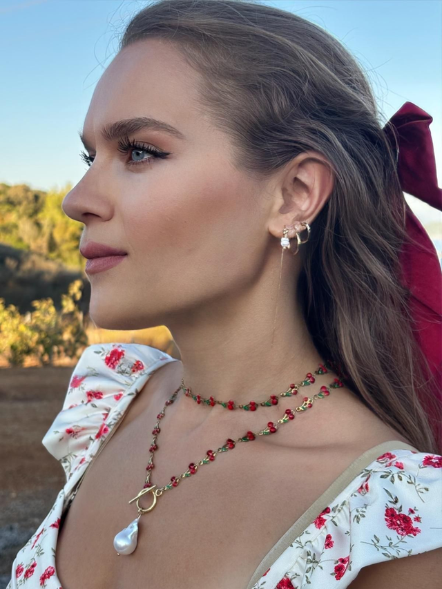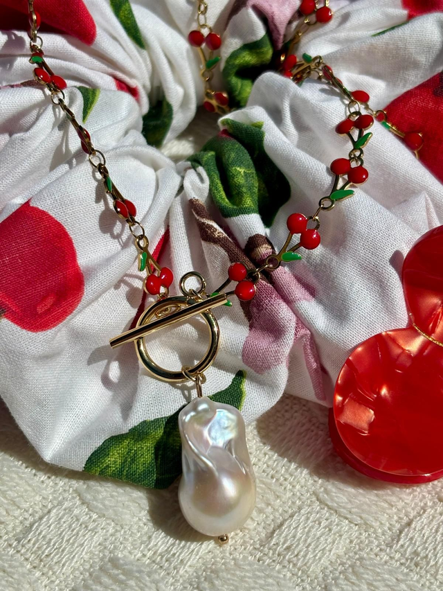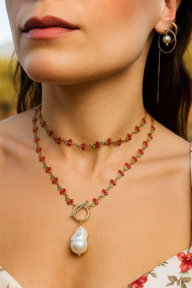 Collana a doppio collo in acciaio chirurgico, con smaltatura a forma di ciliegie e perla a pendente.