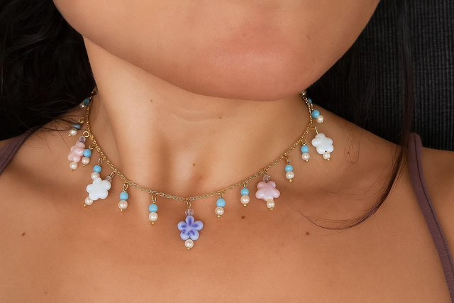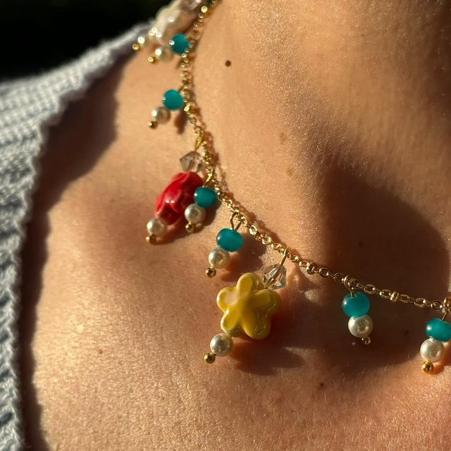 Le perline di Majorca completano la composizione con la loro luminosità setosa, evocando un’eleganza classica ma rivisitata in chiave moderna. Ogni elemento è scelto per la sua qualità e bellezza, creando una collana dal carattere raffinato e al tempo stesso distintivo.