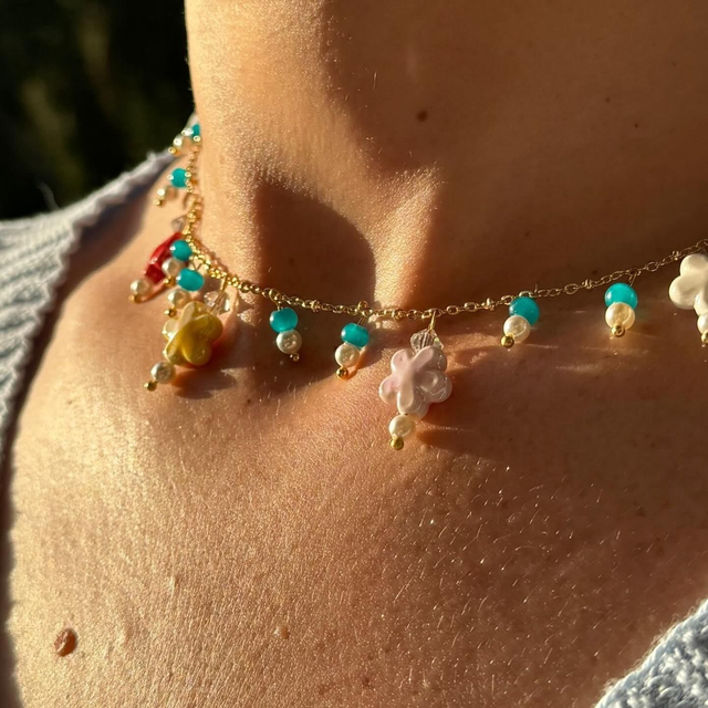 La collana Margot è un viaggio tra eleganza e artigianalità, dove materiali preziosi e dettagli raffinati si incontrano in un design unico e armonioso. Realizzata in argento placcato oro 18k, presenta una sequenza equilibrata di inserti in giada azzurra, simbolo di calma e serenità, alternati a tocchi di ceramica italiana finemente lavorata.
