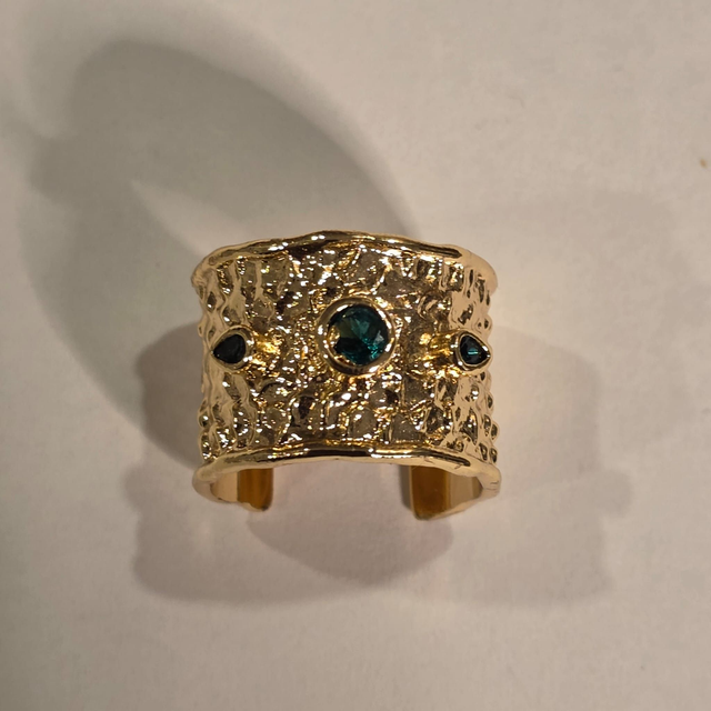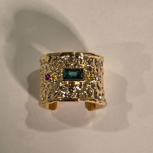 Anello in bronzo battuto placcato oro, con incastonati zirconi colorati. Disponibile in varie colorazioni.
