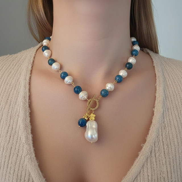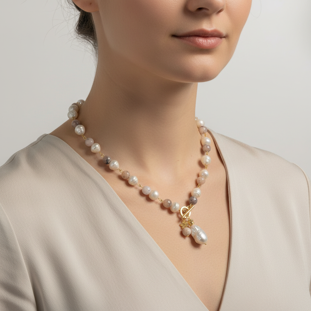 A completare l'opera, una deliziosa chiusura a T in argento 925 placcato oro 24k, decorata con piccoli fiorellini dorati che accompagnano due pendenti: uno con perla barocca, l’altro con granato.